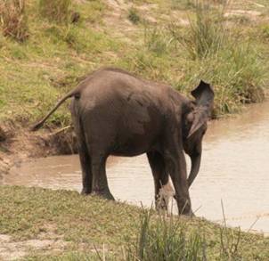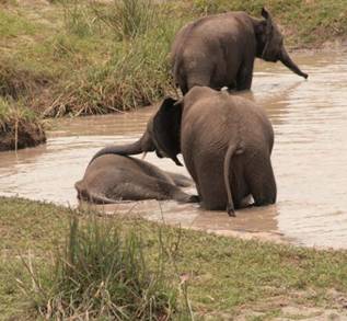 Meanwhile on the other side of the pond, Chidoba, the oldest, was using her trunk to push Rufunsa, the youngest, into the water.