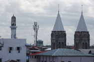(An aerial view of the Stone Town and a collection of three towers, the middle one of modern age lined by a minaret and the twin spires of one of the island’s cathedrals, all in peaceful coexistence)